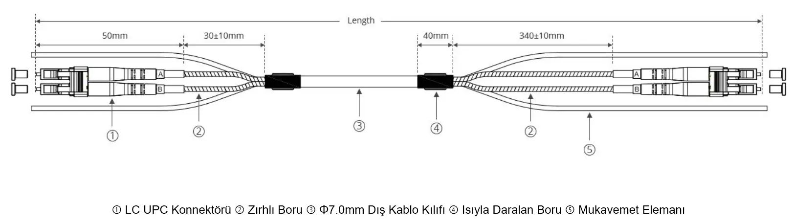 G657.A2 sınıfı fiber kablo ve LC UPC dupleks konnektörlerden oluşan kablo, zırhlı yapısı sayesinde üstün ezilme direnci ve yüksek esneklik sunar.