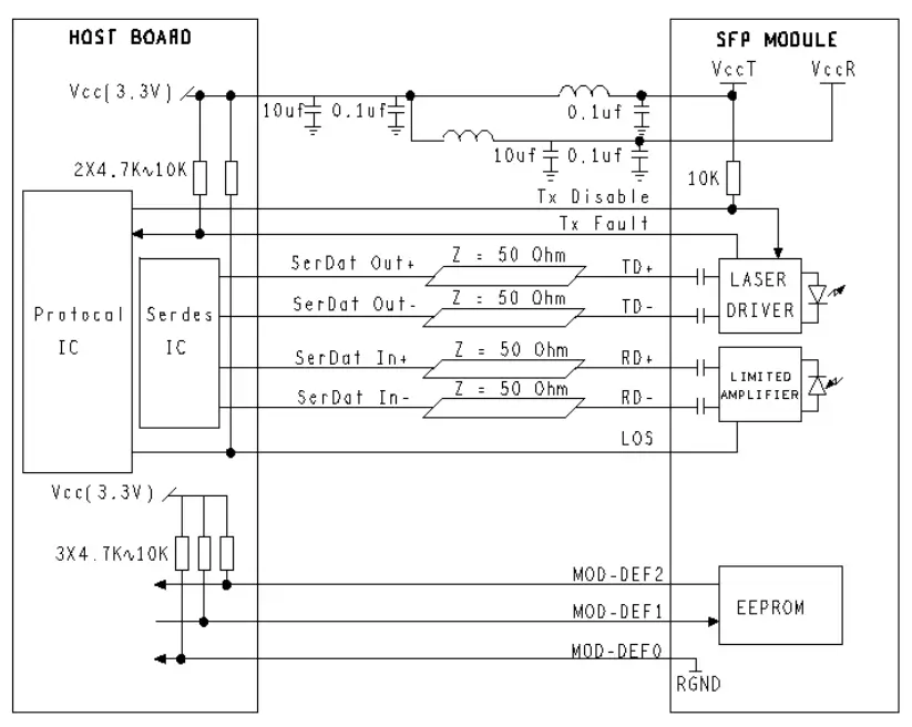 - LOS (Loss of Signal), açık kollektör (open collector) bir çıkıştır. Ana kart üzerinde 4.7k~10kΩ direnç ile 2.0V ile Vcc+0.3V arasındaki bir gerilime pull-up yapılmalıdır.